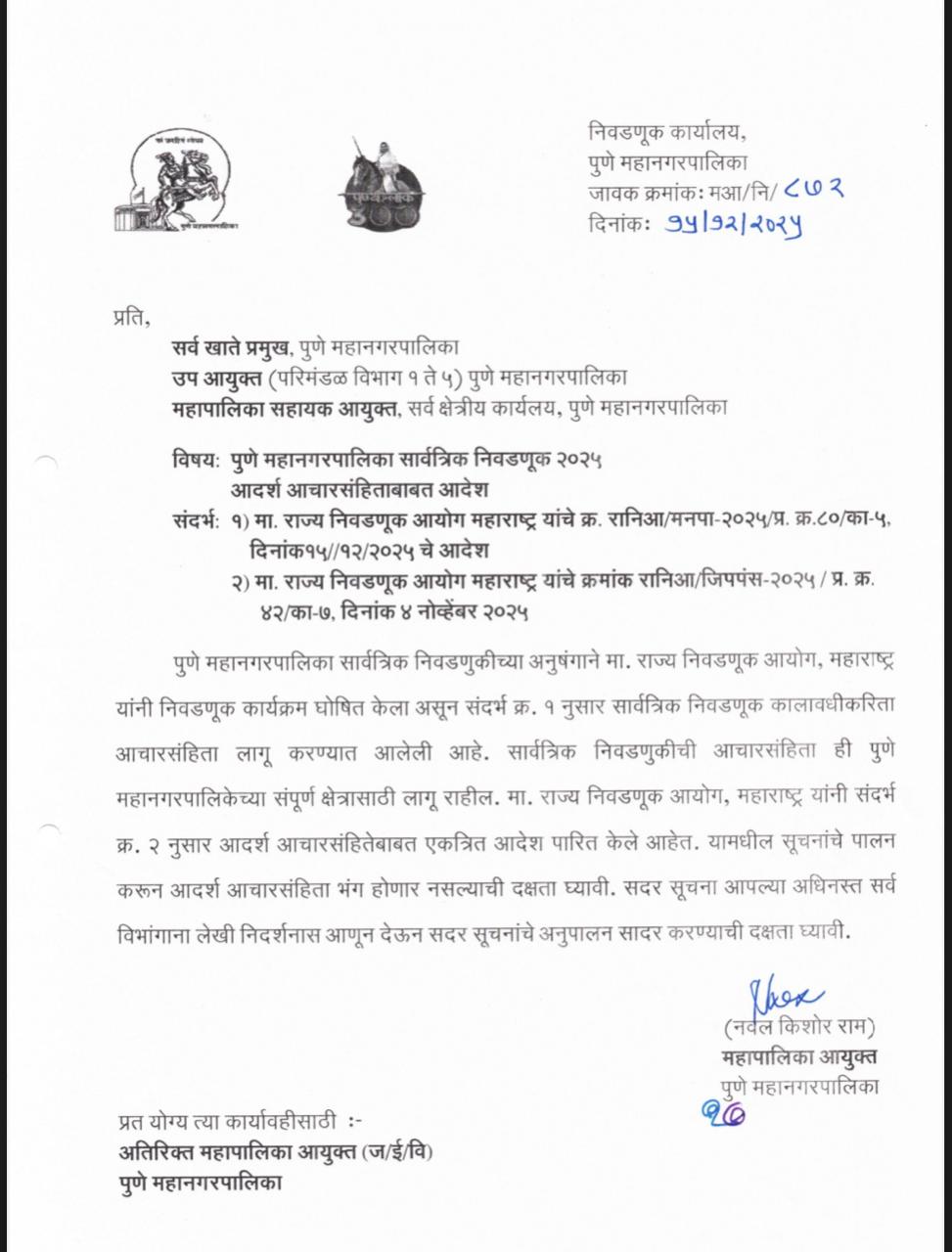 PMC Election January 2026 – (The Karbhari News Service) – राज्य निवडणूक आयोगाने पुणे महापलिका निवडणुकीचा कार्यक्रम घोषित केला आहे. शिवाय तत्काळ आचारसंहिता देखील लागू केली आहे. त्यानुसार महापलिका आयुक्त नवल किशोर राम (Naval Kishore Ram IAS) यांनी आचारसंहिते बाबत आदेश जारी केले आहेत. (Pune Corporation Election)