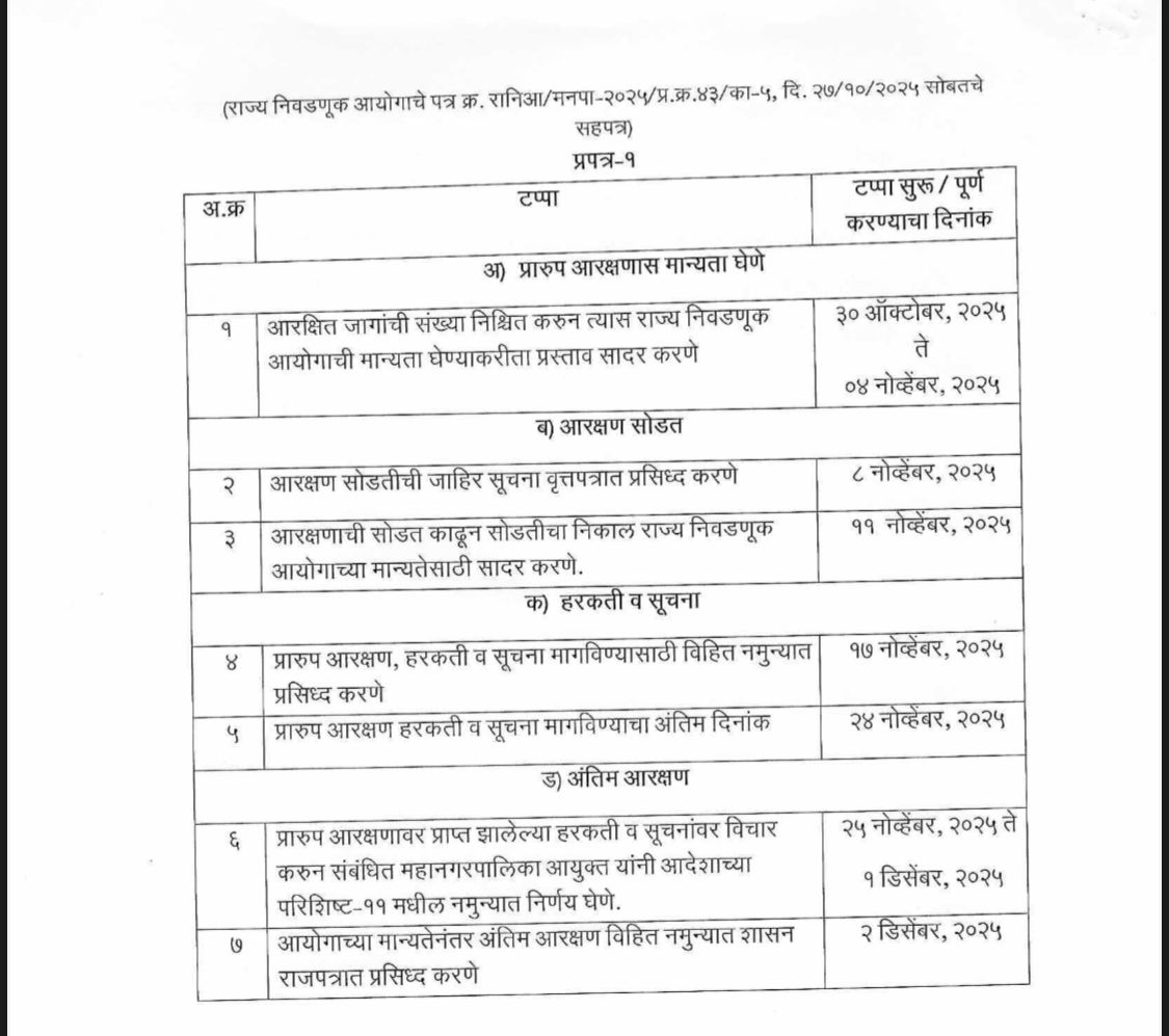 प्रारुप आरक्षण हरकती व सूचना मागविण्याचा अंतिम दिनांक – २४ नोव्हेंबर, २०२५