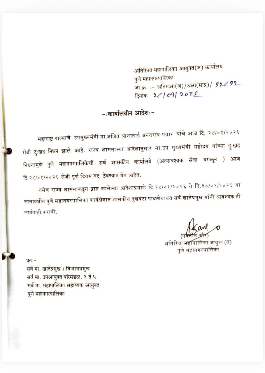 Pune PMC News – (The Karbhari News Service)– महाराष्ट्र राज्याचे उपमुख्यमंत्री तथा पुणे जिल्ह्याचे पालकमंत्री यांचे अपघाती निधन झाले आहे. त्या निमित्ताने पुणे महापालिकेची सर्व कार्यालये आज (२८ जानेवारी) बंद ठेवण्यात येणार आहेत. मात्र अत्यावश्यक सेवा सुरु राहतील. अतिरिक्त आयुक्त पवनीत कौर यांनी हे आदेश जारी केले आहेत.