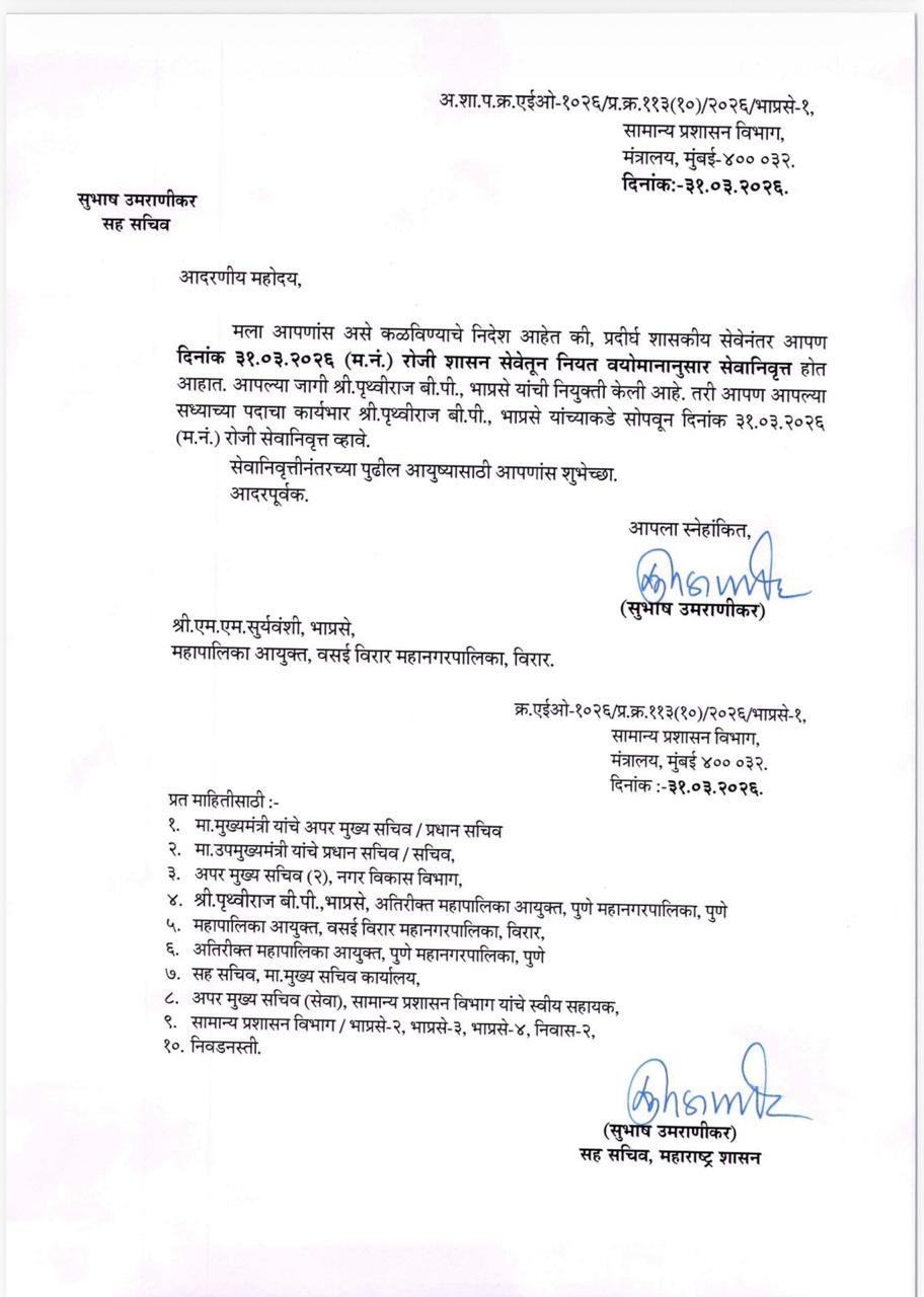 पृथ्वीराज बी पी यांचा पुणे महापालिकेतील कार्यकाळ संपत आला होता. त्यानुसार सरकारने त्यांची बदली केली आहे. वसई विरार महापालिकेचे आयुक्त एम एम सूर्यवंशी हे आज सेवानिवृत्त झाले आहेत. त्यांच्या जागी पृथ्वीराज यांची नियुक्ती करण्यात आली आहे. राज्य सरकारचे सह सचिव सुभाष उमराणीकर यांनी हे आदेश जारी केले आहेत.